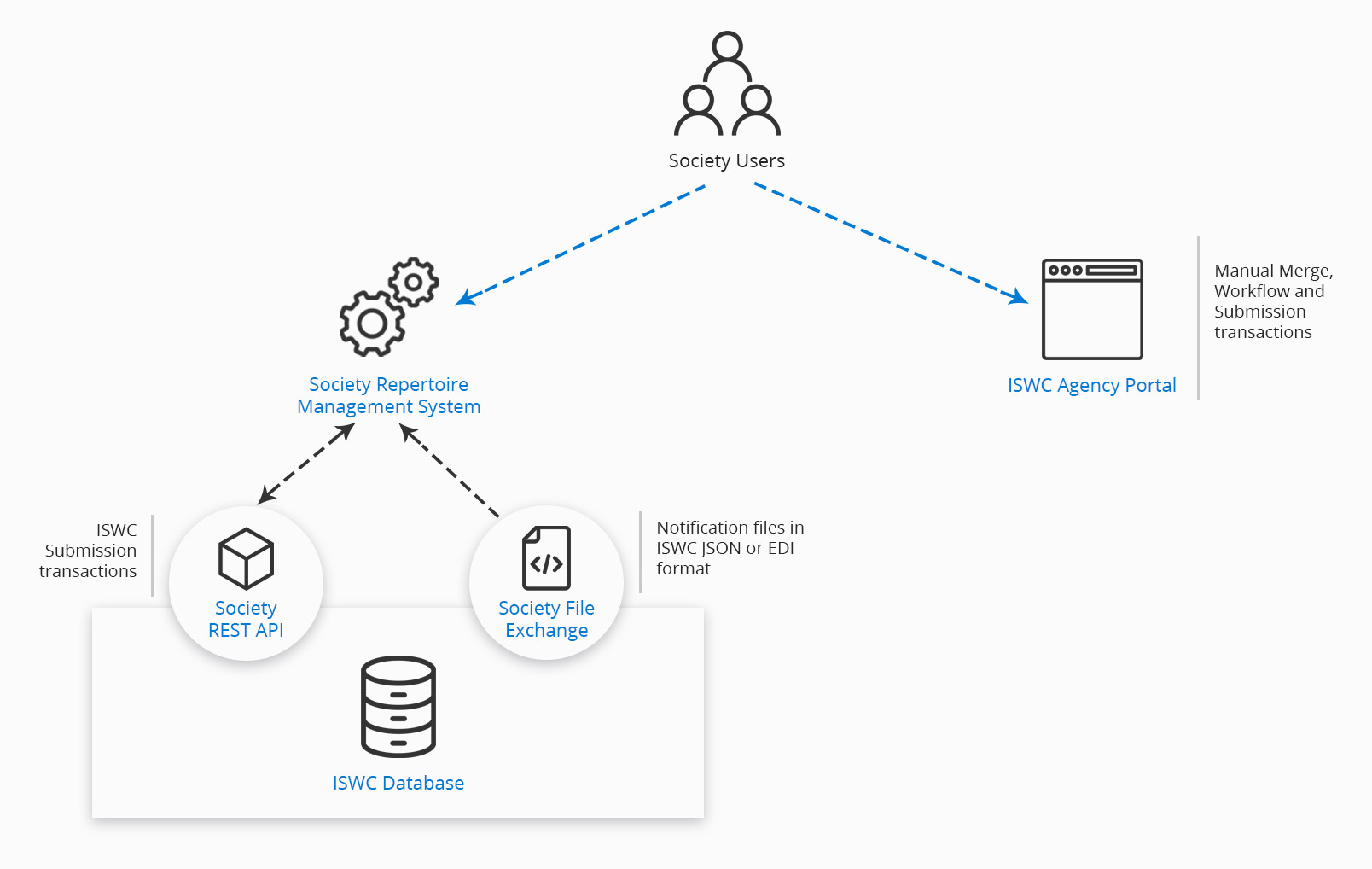 The recommended approach for integrating with the new ISWC Database is to use the REST based API. This API was launched as part of the ISWC modernization project in July 2020. This approach is the only supported approach for those societies still assigning ISWCs from a local range after 1st January 2020.